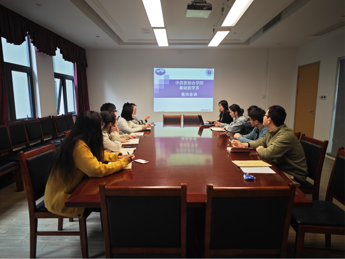 2024年4月17日,依托于公司灵素工作坊,中西医结合基础教研室和循证与转化医学教研室全体教师,在丰盛楼102会议室举行集体备课活动,备课的主题为探讨《中西临专业导论》课程的教学设计及课程思政建设思路。活动由中西医结合基础教研室副主任成小兰主持。