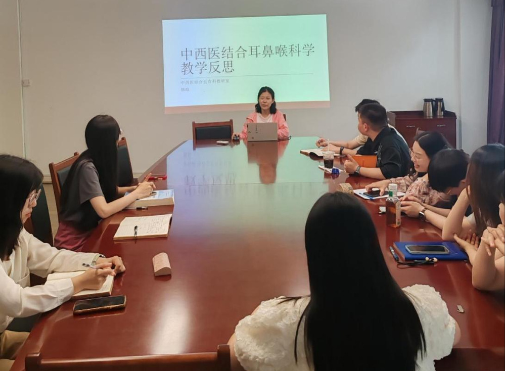 首先,中西医结合耳鼻喉教研室韩暄老师以“中西医结合耳鼻喉科学教学反思”为题进行分享,她围绕《中西医结合耳鼻喉科学》课程在教学过程中存在的问题,如课程课时分布不均衡、中西医结合优势病种未明确等进行讲述,并提出相应解决方案,她认为应注意选择临床常见病种和中西医结合优势病种进行重点讲解,同时需重视临床专科检查技能的训练。