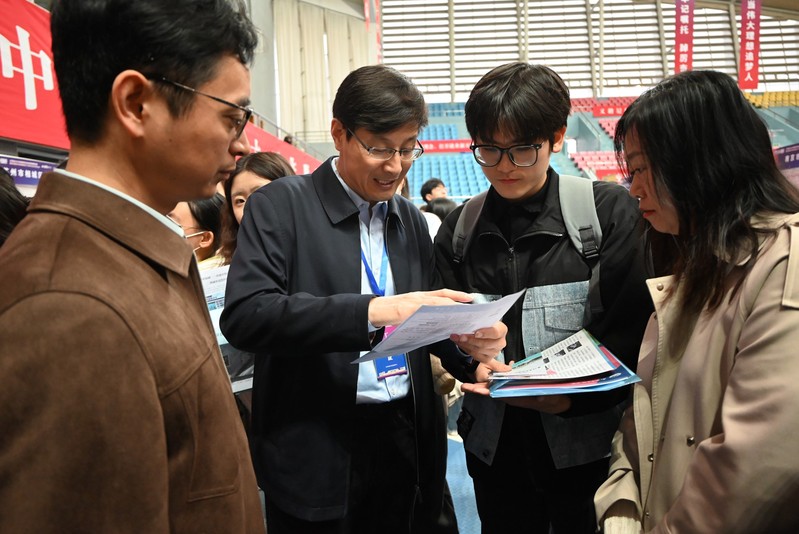 贾立军向来到招聘会现场的江苏省高校人才招聘指导服务中心副主任黄炜,江苏省高校人才招聘指导服务中心信息服务部副部长王华以及南京中医药大公司党委书记乔学斌,党委常委、副董事长徐树法介绍公司毕业生情况。