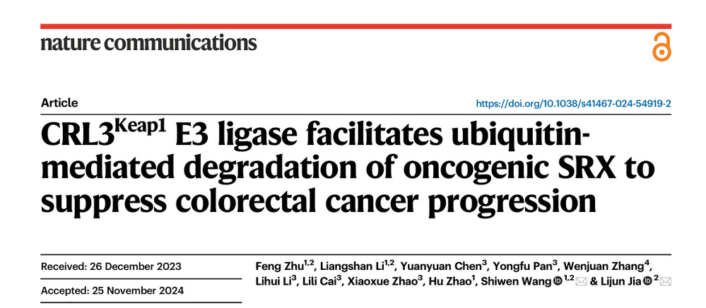 近日,公司贾立军教授团队联合华东医院王诗雯副研究员,在国际知名学术期刊Nature Communications中科院医学一区Top期刊)上发表了题为“CRL3Keap1 E3 ligase facilitates ubiquitin-mediated degradation of oncogenic SRX to suppress colorectal cancer progression”的最新研究成果。该研究揭示了Keap1泛素连接酶可以靶向致癌蛋白SRX发生泛素化降解,而Keap1在结直肠癌中的常见突变失活可诱导SRX积聚,进而通过激活AP1/MMP9通路促进结直肠癌进展。