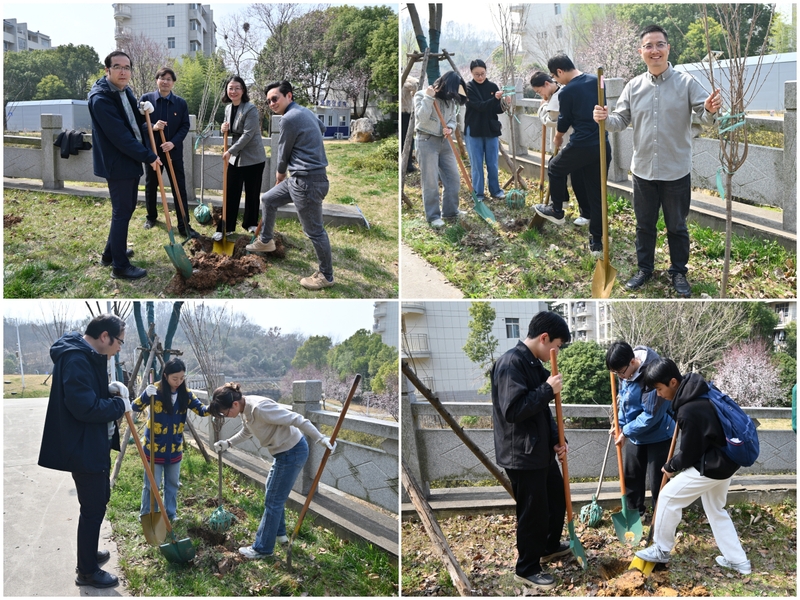 左言富书记讲述了植树节的由来,倡议广大师生要践行习近平总书记“绿水青山就是金山银山”的生态文明发展理念,为美丽校园建设多做贡献。在左言富书记、周恩超副董事长的带领下,大家铆足干劲、分工协作,挥锹铲土、扶苗培土,栽下象征着希望与新生的30株樱花树。