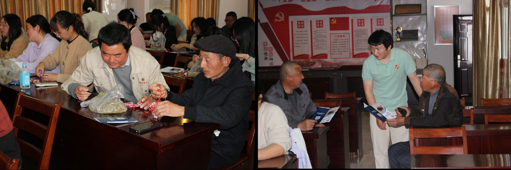 宣讲结束后,员工志愿者向村民发放了驱虫药粉和香囊制作材料,该药粉由艾叶、丁香、桂枝、佩兰、藿香等13味中草药配制而成。志愿者示范了驱虫香囊的制作方法后,村民们热情参与,纷纷动手制作香囊,现场气氛热烈。在此过程中,志愿者在与村民的谈话中了解到,本地蜱传疾病高发、危害大,给村民们的生活带来了极大的困扰。