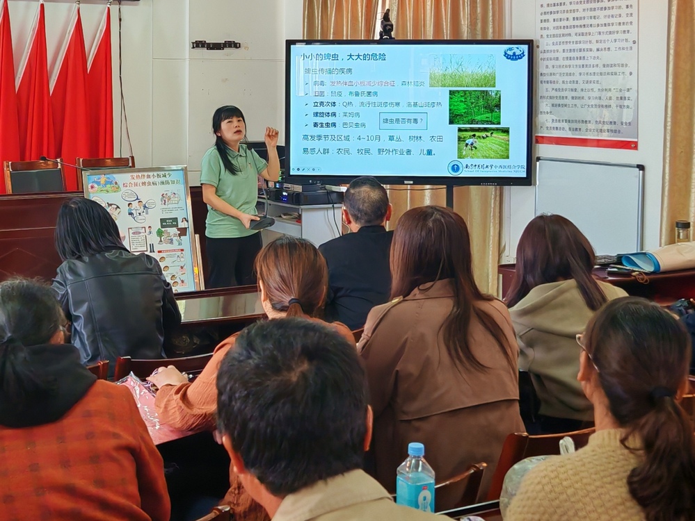 为了使居民更加深入了解蜱虫防治,志愿者服务团队指导老师黄花英以“蜱虫叮咬危害大,科学防护保健康”为主题,开展了一场生动形象的专题科普讲座。她详细讲解了蜱虫的生活习性、潜在健康风险及传播的疾病类型,重点普及了蜱虫的防护以及被蜱虫叮咬后的紧急处理方法。黄老师特别提醒,在4-10月蜱虫活跃季节,村民们前往田野户外,长时间在草丛、灌木丛劳作逗留时,一定要加强个人防护。