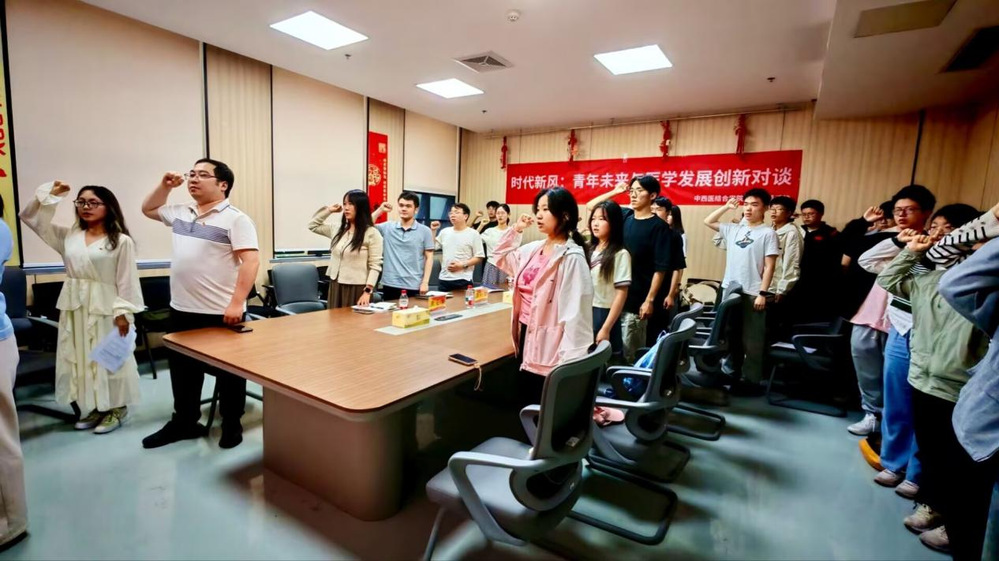 在老师们深入浅出的分享后,现场进入提问交流环节。同学们纷纷踊跃提问,就自己在学习、科研中遇到的困惑,例如如何平衡中医经典理论学习与现代医学技术研究、怎样在科研项目中找准切入点等问题向老师们请教。老师们耐心解答,并结合自身经历给出实用建议,现场互动氛围热烈。最后,全场师生在蔡凌羽同学的带领下,重温入团誓词,郑重宣誓。