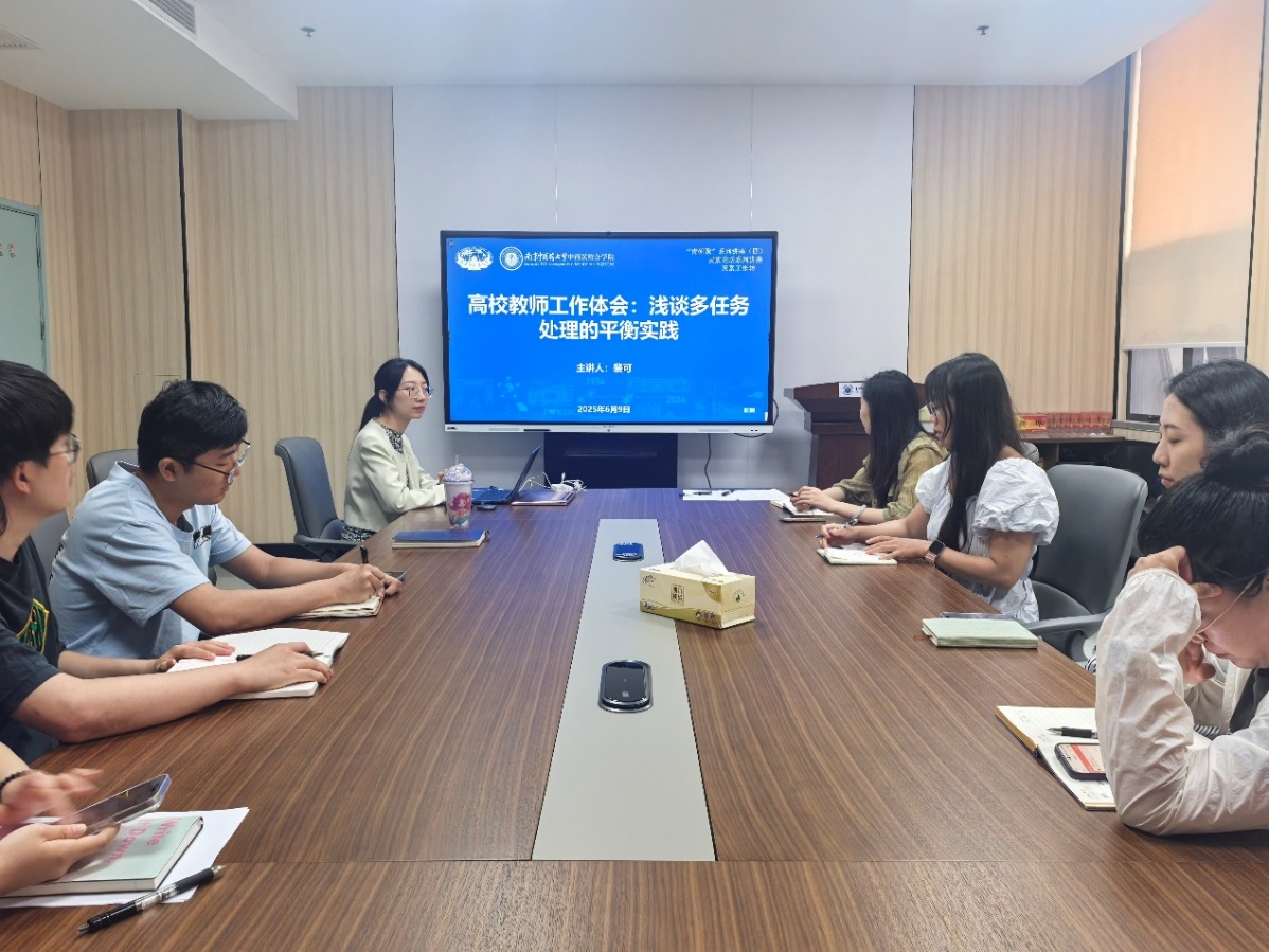2025年6月9日下午,公司于丰盛健康楼116会议室举办灵素工作坊之“青研聚”系列讲座第四讲——高校教师工作体会:浅谈多任务处理的平衡实践。本次活动由beat365亚洲体育官方网站妇科教研室黄雯洁主持,中西医结合内科教研室裴可担任主讲,公司全体青年教师及研究生代表参加此次讲座。