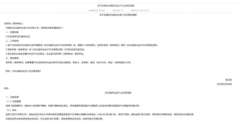 5月底,根据保卫处相关通知要求,辅导员开展2025届毕业生户口迁移工作,根据保卫处前期统计户口在校的2025届毕业生情况,辅导员与同学们一一沟通,并提醒毕业生仔细阅读《2025届毕业生户口迁移须知》,根据个人实际情况,填写《2025届毕业生户口迁移登记表》,交至保卫处后,领取户口迁移证交给同学手中。