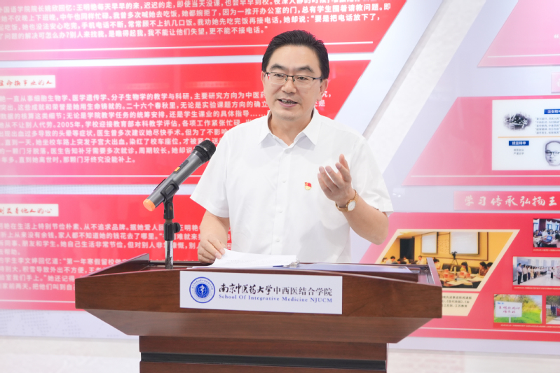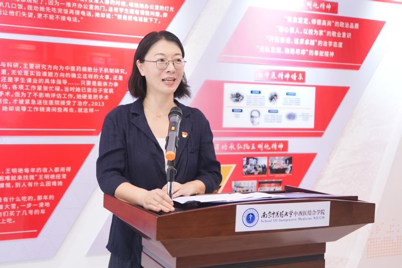 王明艳第二党支部支部书记、中西医结合临床系副主任刘丽娜作为教师代表发言。刘老师表示,作为一线教育工作者,我们将以王明艳老师为榜样,传承弘扬王明艳精神,不断锤炼师德师风,践行“四有”好老师标准,坚守育人初心,以高尚的师德、扎实的学识赢得员工尊重,为中医药事业培养高素质人才,为服务健康中国战略,建设教育强国贡献力量。