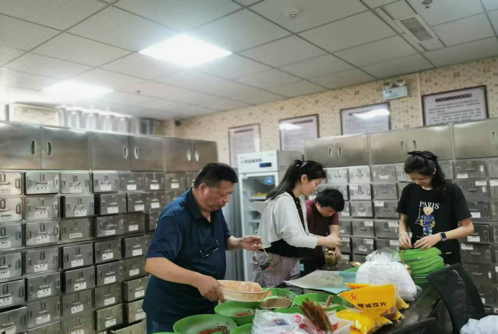 活动筹备阶段,“蜱盾护航队”锚定“科学防治、精准服务”的目标。团队基于药食同源理论,研制出具有预防发热伴血小板减少综合征功效的中药茶,并主动对接公司社会实践基地明光市涧溪镇中心卫生院,寻求专业支持。在卫生院药房内,队员们认真跟随医护人员学习药材的称量、配比及禁忌,从混合调配到分装密封,每一个环节都细致严谨,确保防治药材安全有效。这些药材均是根据当地蜱虫活跃特点配制,搭配团队的科普讲解,让村民用得放心、防得有效。