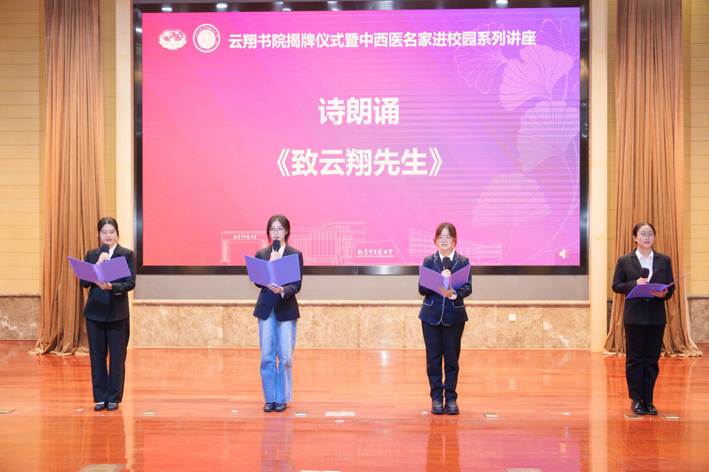 云翔书院黄乐仪、常琳芫、孙咏妍、王旭宁四位员工代表带来诗朗诵《致云翔先生》,通过朗诵自创诗歌,传颂邹云翔教授的卓越成果与潜心治学、传道授业的医学精神,表达当代中医学子传承创新、再创辉煌的使命担当。