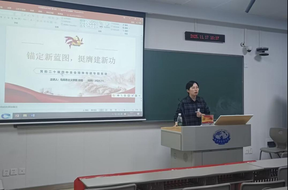 随后,徐璐老师以《锚定新蓝图,挺膺建新功:学习党的二十届四中全会精神》为主题开展培训第一讲。徐璐老师详细讲解了二十届四中全会的精神内涵。以“村村通路,网络助农服务发达”的过往经历为索引,徐璐老师用通俗易懂的语言和身边发生的现实案例,让同学们深刻体会到了政策落实给人民带来的变化与便利,并进一步理解了全会精神的重要意义。